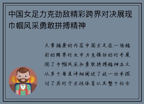文章摘要的内容:中国女足在一场精彩的跨界对决中力克强劲的对手,展现了巾帼风采和勇敢拼搏精神。本文从多个角度详细阐述了这一壮举,探讨了其对于女性体育以及整个社会的重要意义。
