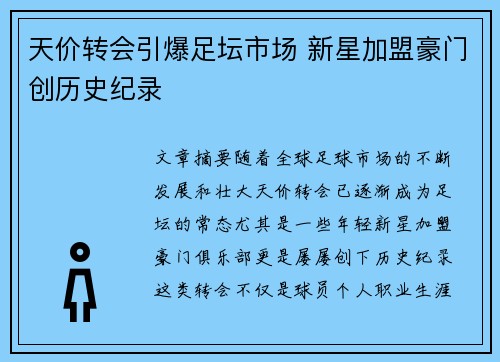 随着全球足球市场的不断发展和壮大,天价转会已逐渐成为足坛的常态,尤其是一些年轻新星加盟豪门俱乐部,更是屡屡创下历史纪录。这类转会不仅是球员个人职业生涯的重要转折点,也是俱乐部、球迷乃至整个足球产业链的重要节点。通过分析天价转会的背景、原因、市场反响以及对未来的影响,我们可以更清晰地看出当代足球产业中的复杂关系和趋势。本篇文章将从四个方面详细探讨天价转会引爆足坛市场的现象,分别为“球员价值的飞跃与影响”、“豪门俱乐部的商业考量”、“足坛市场的激烈竞争”、“新星加盟带来的创新与历史突破”,希望通过这些层面的解析,展现这一现象的多维度特征。