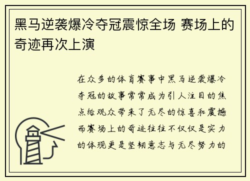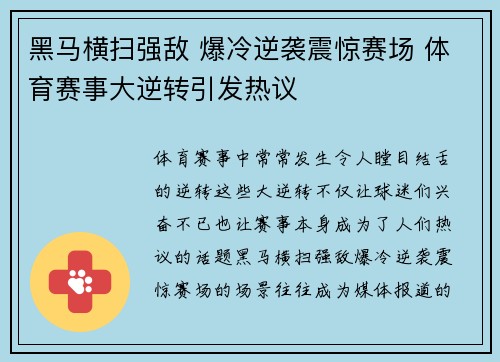 黑马横扫强敌 爆冷逆袭震惊赛场 体育赛事大逆转引发热议